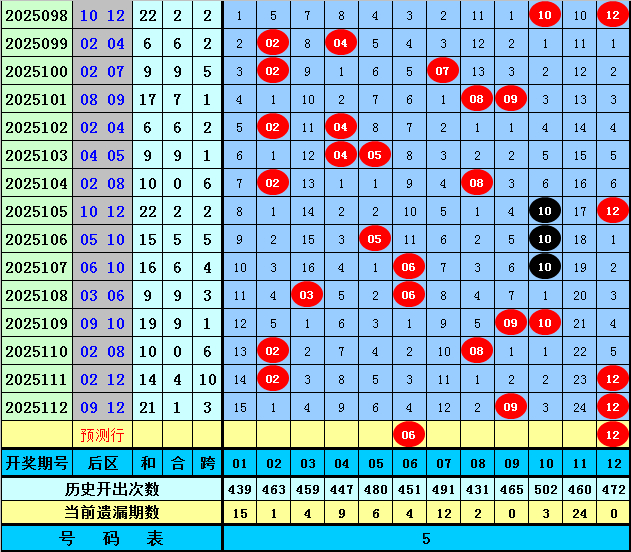 后区分析(定义:01-04为一区,05-08为二区,09-12为三区):上期后区开出奖号09和12,全在第三区出现,最近10期后区三个区间落号个数比为5:6:9,本期后区注意第二区和第三区号码出现,关注两码06、12。