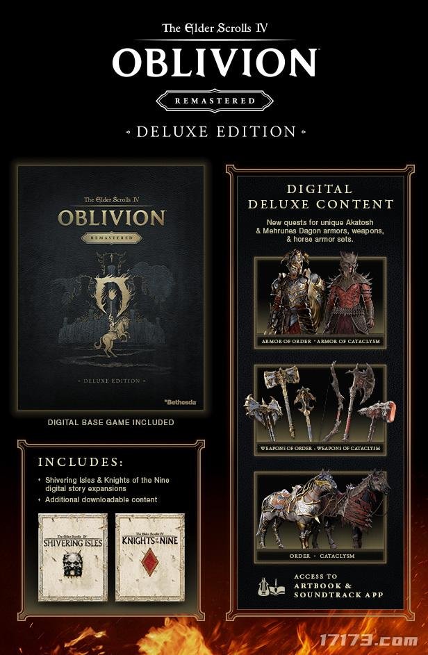 豪华版的内容还将包含专属数字版阿卡托什及梅鲁涅斯·大衮护甲、武器及马匹护甲套装等,还有额外的可下载内容如《斗士要塞》、《法术秘典》、《污秽之巢》、《梅鲁涅斯之刃》等以及数字版艺术设定集和游戏原声带应用程序。