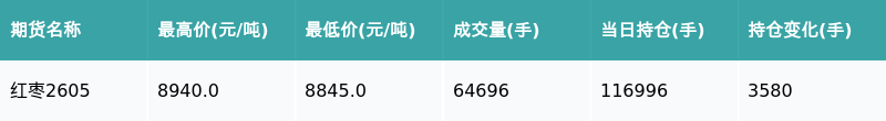 南财智讯2月26日电,盘后期货数据显示,郑州商品交易所的红枣主力合约收涨0.28%,收盘报8935.0元/吨,日内资金流入3134.04万元。其他相关指标见下表: