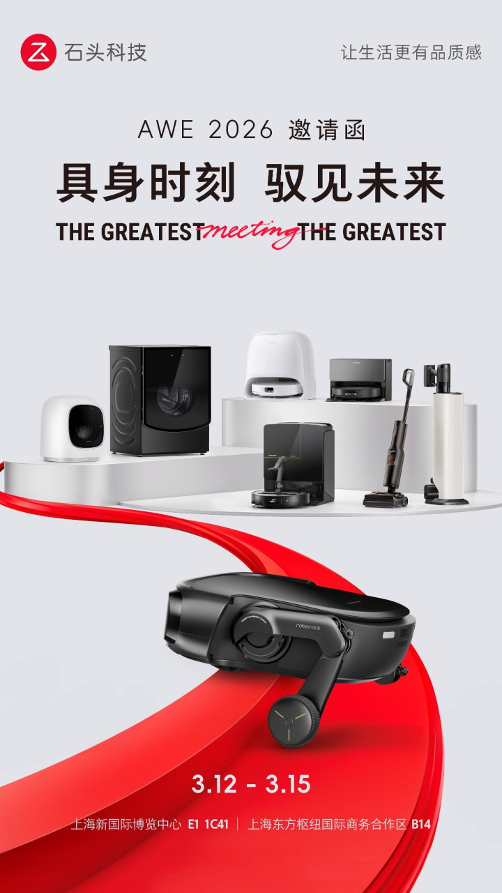 2026年3月12日至15日,中国家电及消费电子博览会(AWE2026)将在上海新国际博览中心举行。石头科技本次将以“具身时刻驭见未来”为主题参加AWE2026展会,展示其在智能清洁领域的最新成果,展位位于E1馆1C41。