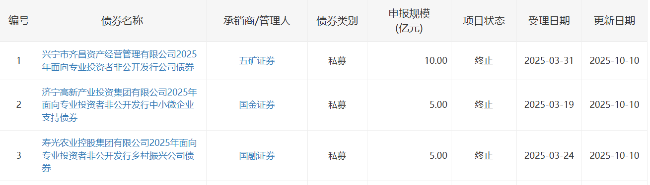 具体来看,“兴宁市齐昌资产经营管理有限公司2025年面向专业投资者非公开发行公司债券”项目状态更新为终止。该债券拟发行金额10亿元,承销商/管理人为五矿证券,受理日期为2025年3月31日。