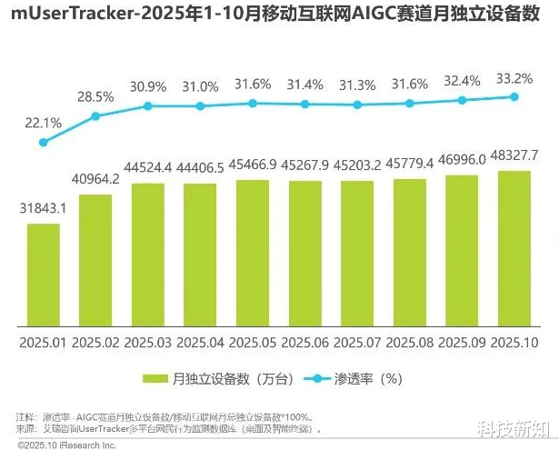 就像报告显示,2025年1-10月,中国移动互联网AIGC赛道进入规模化应用期,用户规模达4.83亿,市场渗透率突破30%,标志着AIGC已从“尝鲜工具”转变为大众级应用。在语言模型领域,豆包APP流量领先,月独立设备数达13253.5万台;腾讯元宝增速尤为突出,近9个月复合增长率达385.1%,凭借微信生态的天然流量池及腾讯系产品协同优势,快速跻身头部阵营。