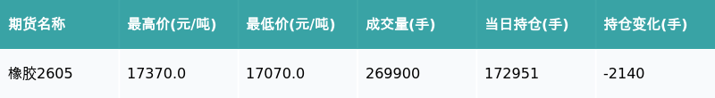 南财智讯2月26日电,盘后期货数据显示,上海期货交易所的橡胶主力合约收跌0.46%,收盘报17125.0元/吨,日内资金流出1.25亿元。其他相关指标见下表: