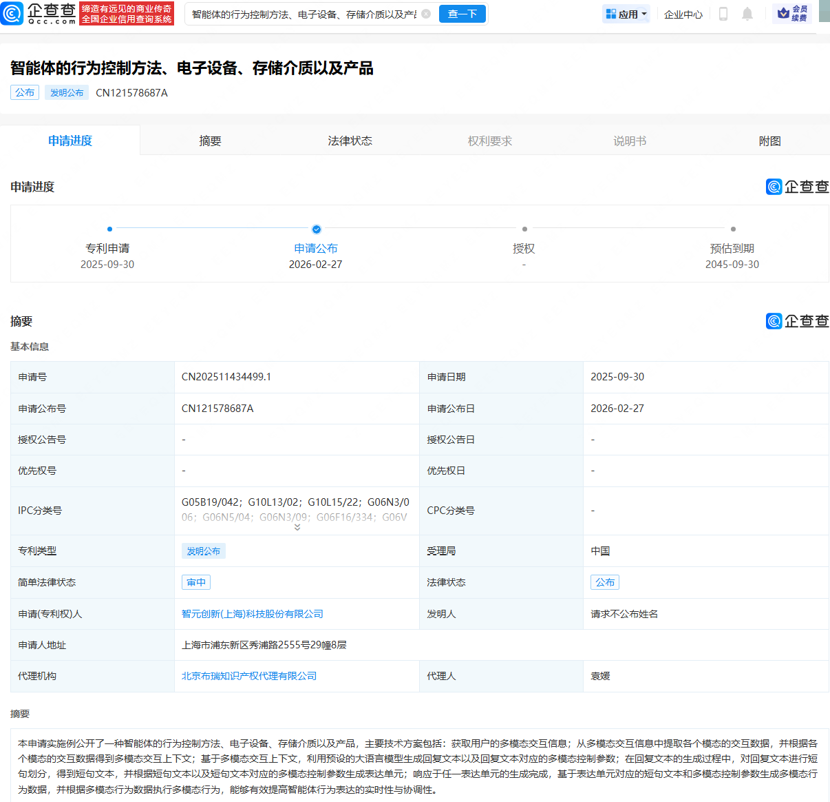 近日,智元创新(上海)科技股份有限公司申请注册“智能体的行为控制方法、电子设备、存储介质以及产品”专利。专利摘要显示,主要技术方案包括:获取用户的多模态交互信息;从多模态交互信息中提取各个模态的交互数据,并根据各个模态的交互数据得到多模态交互上下文;基于多模态交互上下文,利用预设的大语言模型生成回复文本以及回复文本对应的多模态控制参数;在回复文本的生成过程中,对回复文本进行短句划分,得到短句文本,并根据短句文本以及短句文本对应的多模态控制参数生成表达单元;响应于任一表达单元的生成完成,基于表达单元对应的短句文本和多模态控制参数生成多模态行为数据,并根据多模态行为数据执行多模态行为,能够有效提高智能体行为表达的实时性与协调性。