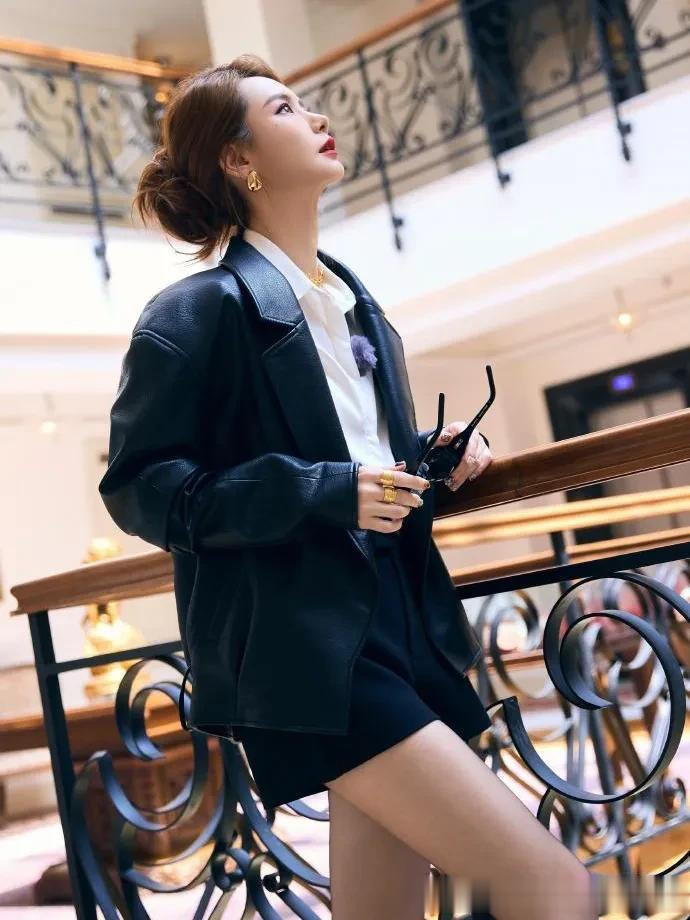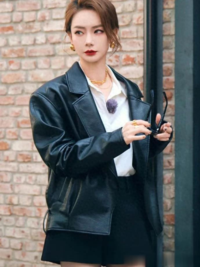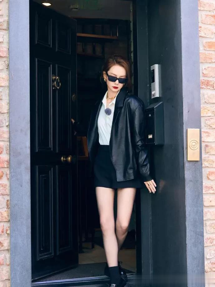 顶级配资平台戚薇会穿是数一数二的! 黑色皮衣+短裙+短靴, 时髦洋气又高级