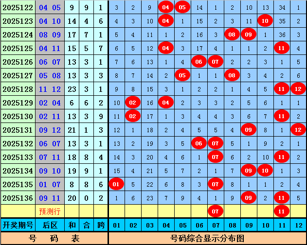 大乐透第2025136期奖号为:07、11、15、16、23+09、11。其中前区三区比为2:3:0,大小比为1:4,包含1个重号,包含连号,后区为全奇号码。