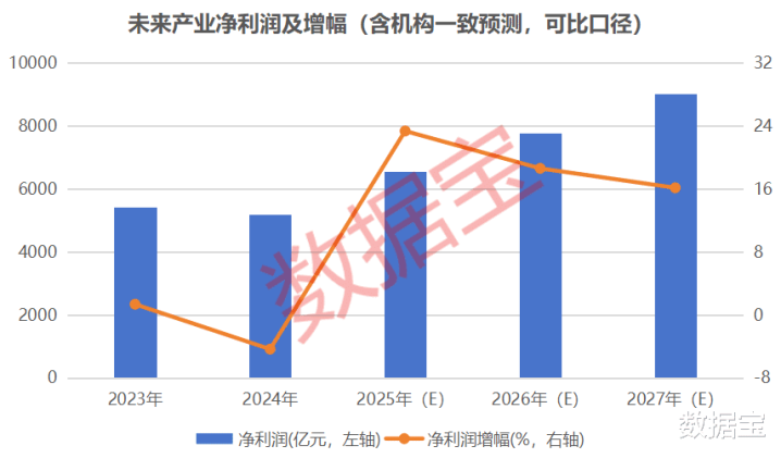 未来产业展现出了强大的增长动能。据证券时报·数据宝统计,上文提及的7个未来产业共涉及381家公司,这些公司2023年、2024年净利润整体增幅(可比口径,下同)偏弱,且2024年净利润略有下降,结合机构一致预测的净利润中值来看,2025年这些公司整体净利润中值超过6500亿元(不含未获机构预测的公司),同比增幅有望超过20%,2026年、2027年整体净利润增幅均有望超过15%。