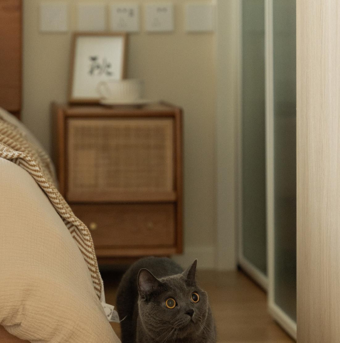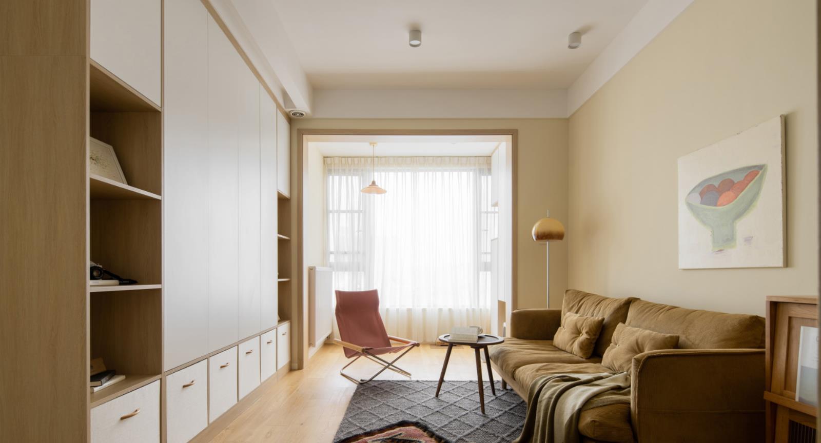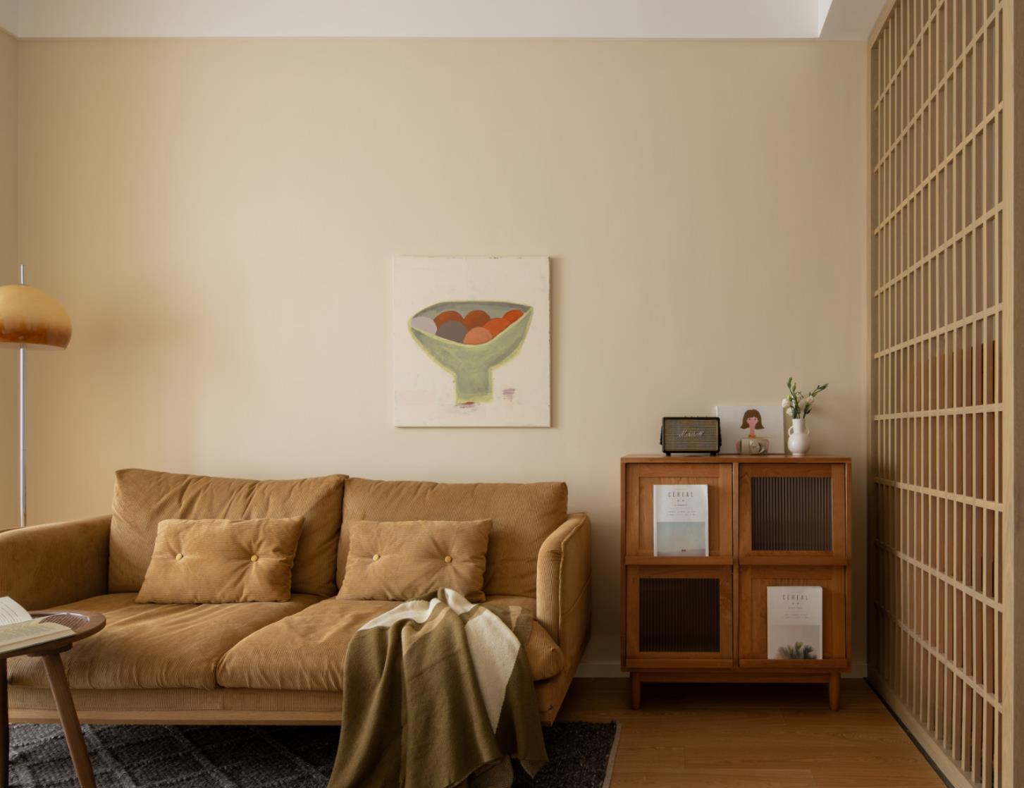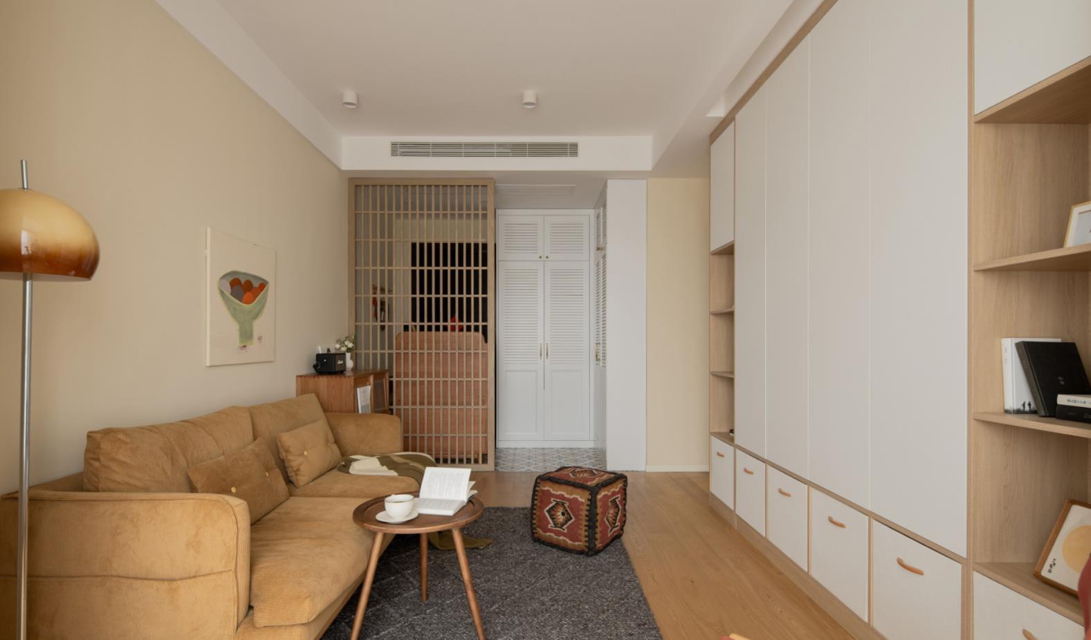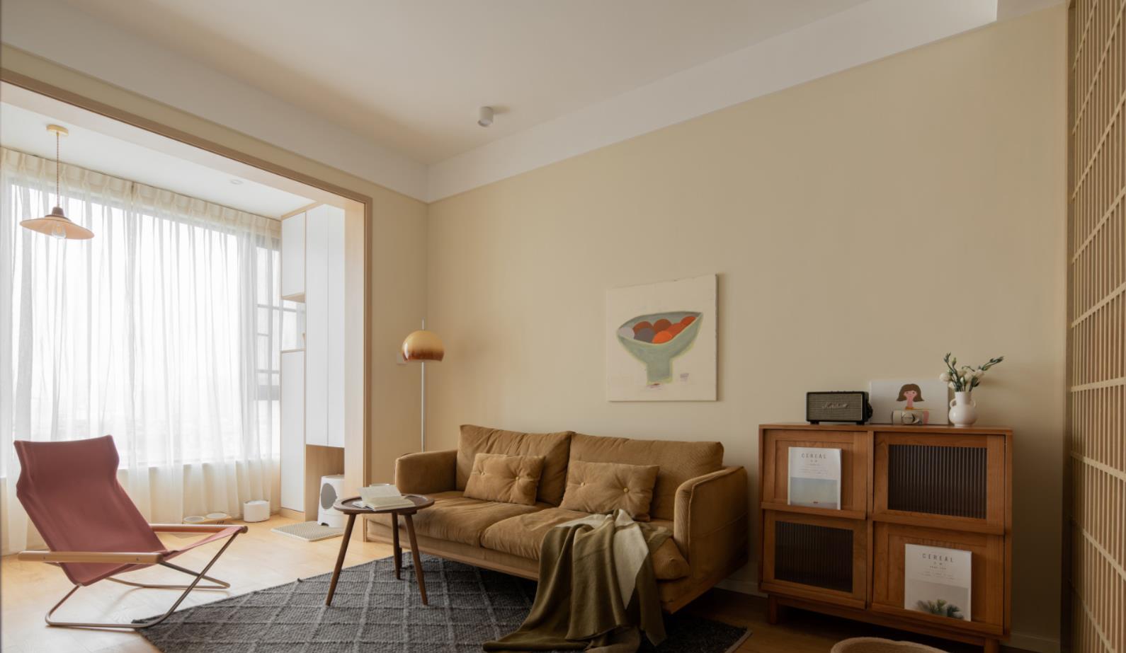 小体积的绒面沙发、粗布材质的地毯、以及一盏复古的落地灯组合,不仅给予了居住者更加舒适的使用体验,在家里有宠物的情况下,也完全避开了猫咪乱抓的麻烦。而沙发一侧的成品矮柜配置,也在提升空间颜值的同时,方便了一些日用品的收纳。
