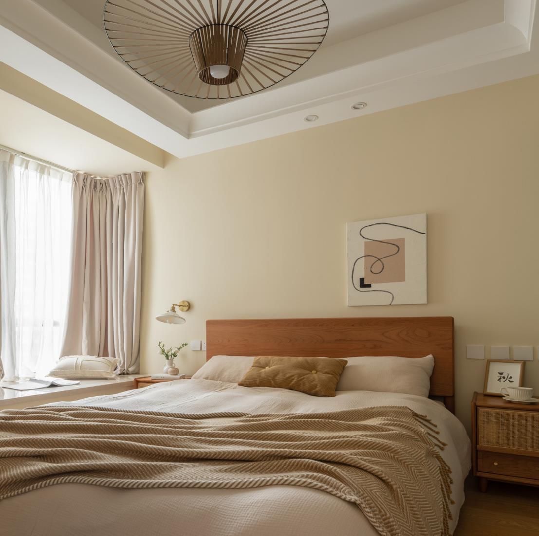 主卧延续了奶油风基调,再搭配上低饱和度的床品,骨子里都透着一抹令人无法拒绝的温柔与治愈。而在飘窗台不可拆的情况下,直接铺上一块大理石,不仅打理起来很方便,也为屋主延伸出了一块极其悠闲的放空角落。
