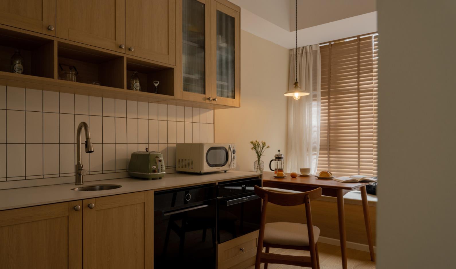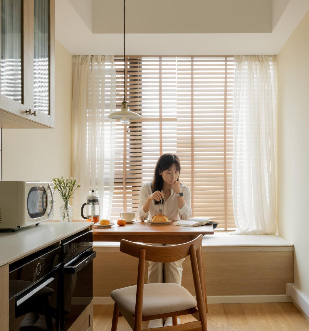 在飘窗台不可拆的情况下,直接将其改成卡座,并搭配一张餐桌来使用,除了带来了极强的实用性之外,白色纱帘与木百叶的存在,也立马拉满了空间的氛围感,就仿佛冬日里的一缕阳光一般温暖、轻柔,并充满了生活的仪式感。