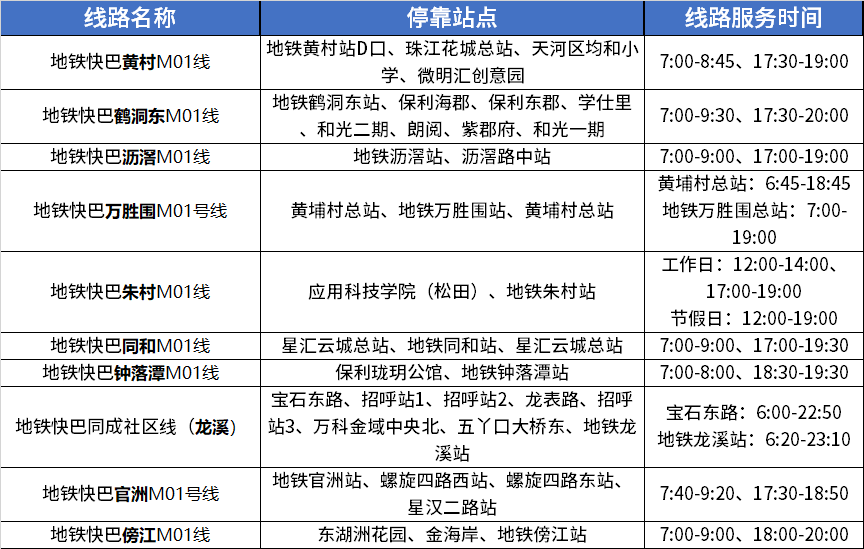 为解决市民通勤“最后一公里”出行痛点,广州巴士集团首批10条“地铁快巴”正式上线运营,重点覆盖鹤洞东、沥滘、黄村、万胜围、朱村、同和、钟落潭、龙溪、官洲、傍江地铁站,接驳周边产业园区、学校及大型社区。具体线路信息如下: